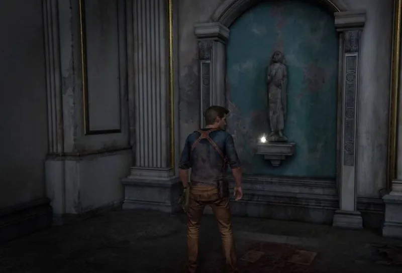 После этого бегите в темный коридор и поднимайтесь по лестнице. Откройте дверь и вы окажетесь в большой комнате. Посмотрите на постамент в центре и осмотрите его. Натан вставляет монету, и начинается следующая головоломка – комната меняется и преображается.