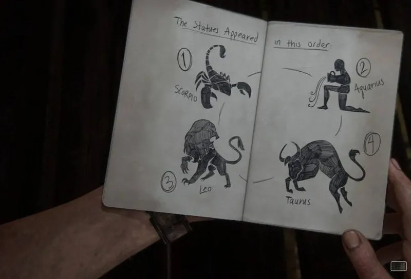 В нем вы найдете запись о том, что Скорпион должен быть первым, Водолей – вторым, Лев – третьим, а Телец – последним. Когда Водолей находится позади вас, вам следует идти налево. Там вы проскакиваете через зубчатое колесо.