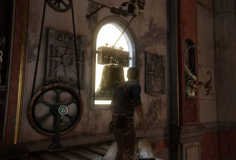Оттуда вы сможете добраться до следующей платформы. Там вы найдете рукоятку для львиного колокола. Снова та же процедура. Натан звонит в колокольчик, Салливан дает сигнал о том, что машина движется. Посмотрите направо вверх, и вы обнаружите следующую платформу.