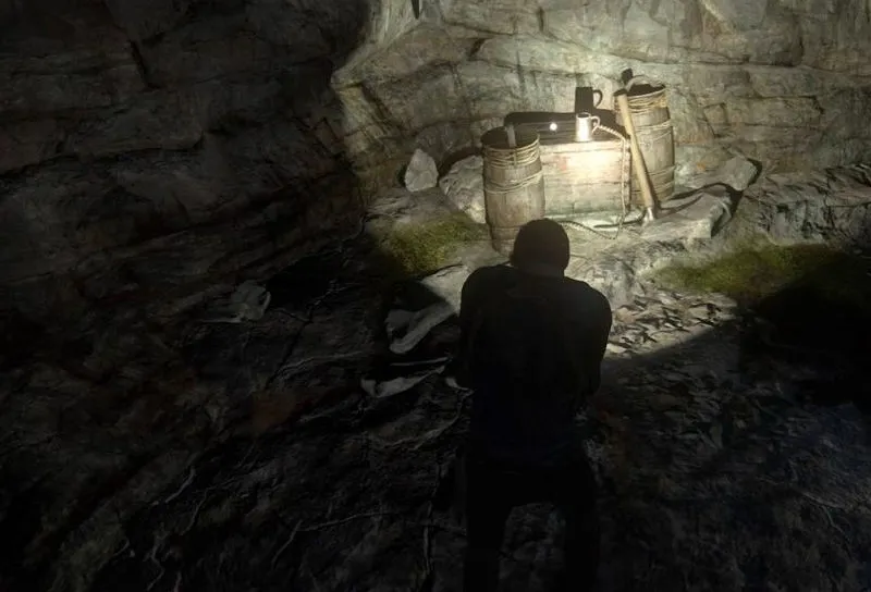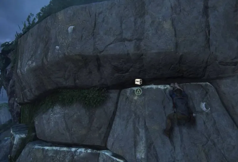 Вы найдете склон, по которому можно скатиться вниз. Спрыгните перед самым обрывом и держитесь за стену. Поднимитесь по водопаду, и Натан включит свой фонарик. Исследуйте немного эту пещеру. В пещере вы найдете небольшой ящик.