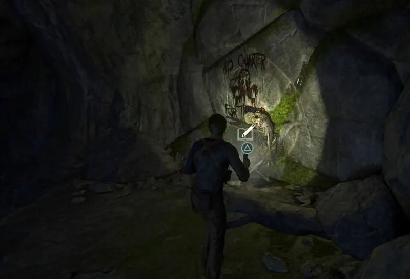 Поднимайтесь. Бегите дальше в пещеру. Вы найдете скелет и настенную картину. Встаньте перед ним, и вы откроете первую запись в дневнике Натана. В этом месте вам нужно развернуться на 180 градусов.
