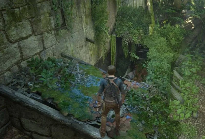 Просто бегите вдоль края скал, пока не достигнете большого одиночного камня. Вы можете спуститься по нему и перемахнуть в следующую зону. На этом заканчивается этот небольшой, насыщенный действиями переход, и вы снова оказываетесь в джунглях. Просто послушайте комментарий Натана.