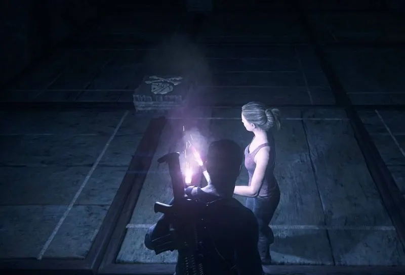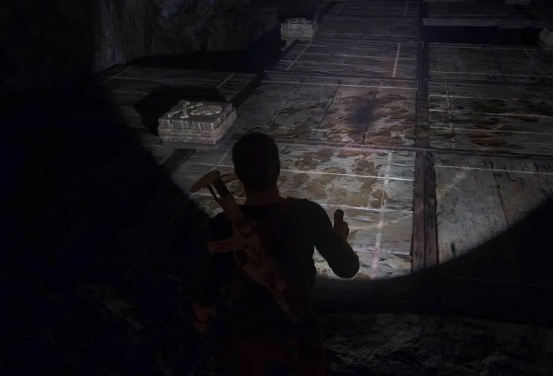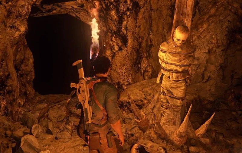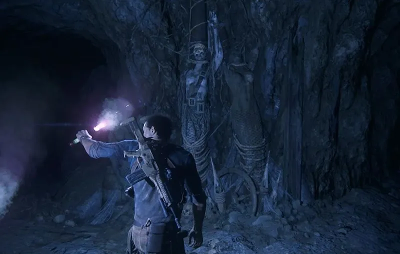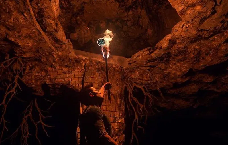 Следуйте за ними, и вы попадете в другой конец комнаты. Продолжайте идти через пещеру слева. Проход обрушивается, и ваша лампа гаснет. Используйте зажигалку Сэма, которая также скоро погаснет. У Елены все еще есть спички. Ей удается зажечь факел в темноте.