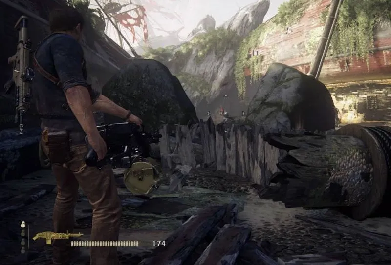 Нет времени перевести дух. Елена и Натан приближаются к цели и брату Сэму. Вы увидите великолепный галеон. Заберитесь на скалы перед ним и откройте вид на кладбище кораблей. Держитесь правой стороны и продолжайте подниматься по скалам.