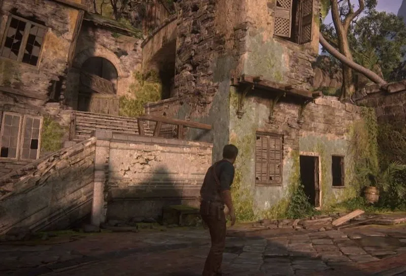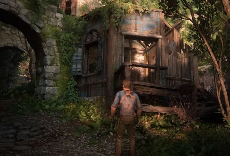 Справа от статуи вы обнаружите стену, на которую невозможно забраться. Но опять же тележка – это решение. Подтолкните тележку, которая находится в центре площади, к стене и заберитесь наверх. Группа снова вынуждена разделиться, и Натан продолжает путь один.