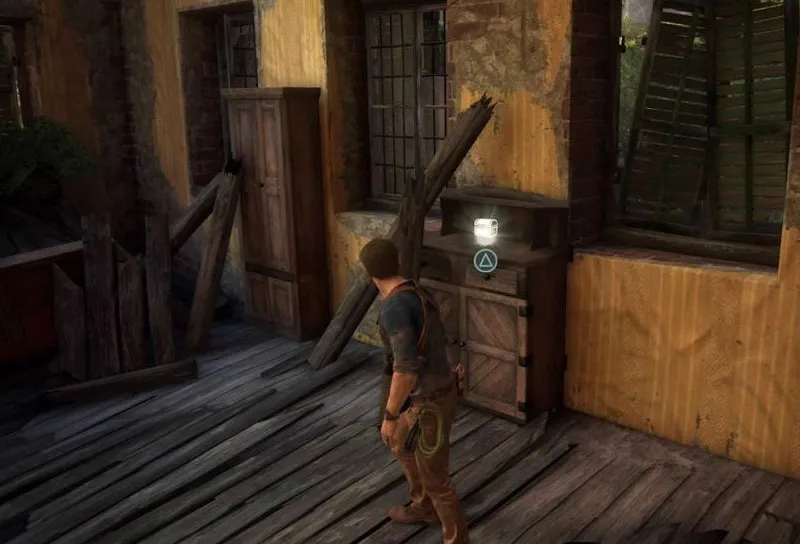 Заберитесь через единственное доступное окно. Вы выйдете на открытое пространство. Вы найдете канатную дорогу, но, похоже, она больше не работает. Бегите к Сэму, он толкает балку в сторону ямы. Вы можете использовать его, чтобы заставить Натана перепрыгнуть на другую сторону.