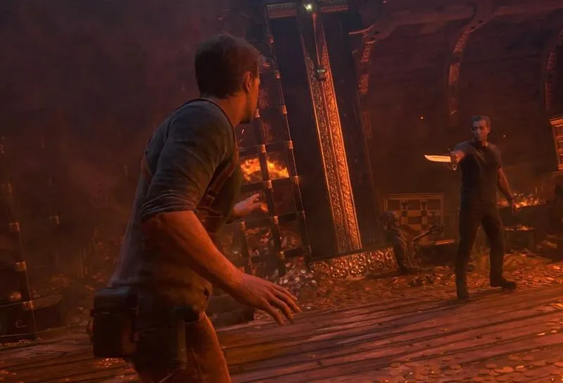 Сэм тоже с ним. К ним присоединяется Надин, и ситуация становится немного запутанной. Очевидно, она не заинтересована в том, чтобы продолжать поддерживать Рэйфа. Она оставляет вас обоих, а Нейтан и Рэйф ссорятся. В схватке с боссом вам предстоит сразиться с безумным охотником за сокровищами. Он атакует вас своей саблей.