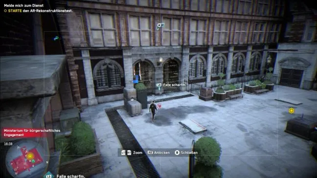 Задание приведет вас в Министерство гражданской активности, где вы сразу же направитесь к обозначенному входу с западной стороны. Внимание: не проходите вслепую через металлодетекторы, которые светятся красным цветом, иначе сработает сигнализация. Однако за детекторами вы увидите панель управления системой безопасности, которую необходимо взломать. После этого красный свет исчезнет, и вы сможете незамеченным пройти дальше и воспользоваться реле данных на стене справа.