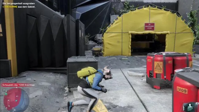 Теперь можно покинуть зону, для чего лучше всего вылезти из подземелья в северном направлении и затем держаться правее. Вы должны наткнуться на несколько ящиков с красными канистрами, а слева от них - на ярко-желтую палатку. За палаткой вы сможете выбраться из зоны благодаря обломкам, а для того чтобы оказаться в безопасности, достаточно пройти мимо нескольких контейнеров.