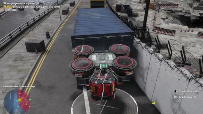 К счастью, неподалеку находится грузовой дрон, который можно захватить благодаря камерам. Внутри запретной зоны найдите любой ящик с красными взрывными контейнерами и поставьте его рядом с плоским контейнером. Затем заберитесь на него и спрыгните в зону.