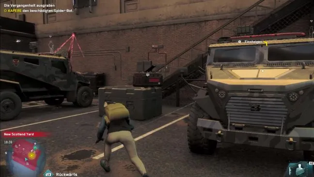 Следующий пункт назначения - Скотланд-Ярд, который, как и все остальные объекты, занят Альбионом. Если вы подойдете к главному входу в северо-западном углу, то сможете захватить дрона и сразу же займетесь противником, который также находится в северо-западном углу и стоит на страже на узкой приподнятой дорожке. Обратите внимание на дверь рядом с ним и ловушку слева: Если Вы ее заминируете, то противник вскоре попадет в нее и упадет вниз.
