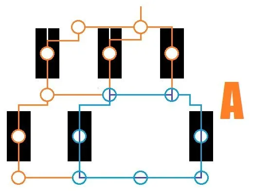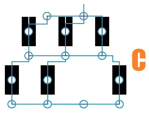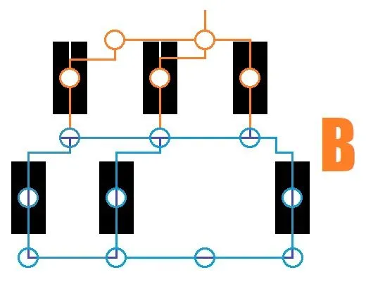 Эскиз (B): Теперь все немного сложнее: Вы уже можете повернуть правый тройник так, чтобы его кончик был направлен вверх. Вернитесь к левому тройнику и снова поверните его так, чтобы вершина была направлена вниз. Спуститесь на один уровень вниз и трижды поверните среднюю L-образную деталь так, чтобы она была направлена влево, а не вправо.
