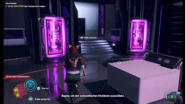 В квантовом ядре "Broca Tech" необходимо уничтожить два терморегулятора. Для этого необходимо открыть их, управляя соответствующей консолью. Добраться до них можно по лестнице на запад и восток.