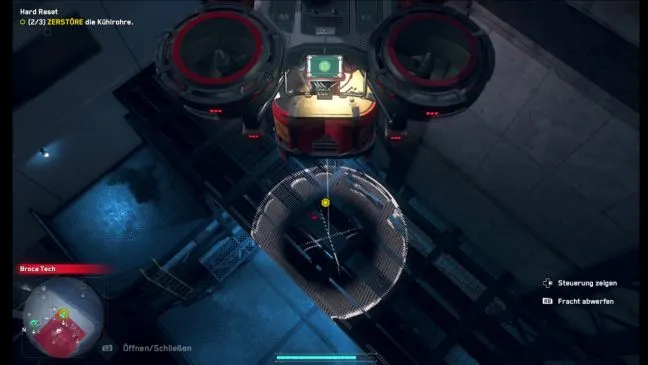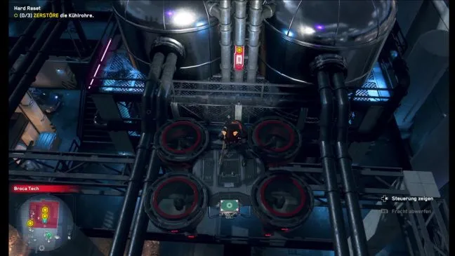 Вы стоите в нескольких метрах от северо-западного входа в Broca Tech, где необходимо уничтожить три охлаждающие трубы. Две из них находятся высоко, и добраться до них можно только с помощью грузового дрона. Третья висит между двумя платформами, но об этом позже.