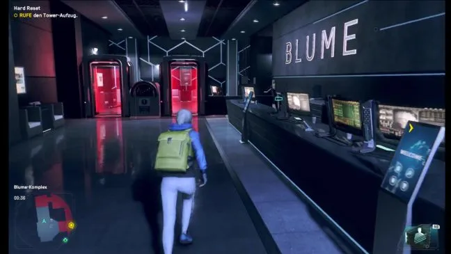 Целевой маркер выведет Вас прямо к главному входу в комплекс Blume, где необходимо вызвать подъемник на вышку. Однако непосредственно за металлодетекторами находится очень много охранников, поэтому мы советуем вам пройти к боковому входу слева или на юго-запад. Там вы сможете легко обмануть детекторы, перепрыгнув через небольшую перегородку справа. Кроме того, здесь есть только один небольшой враг, который не должен представлять для вас проблемы, а в соседней застекленной комнате вы сможете скачать ключ.