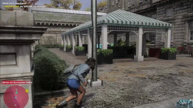 За машинами вы дойдете до угла, где нужно повернуть налево и пробраться мимо кустов и парковых скамеек. Снова опасайтесь охранника, который может появиться навстречу, и, наконец, направляйтесь к первой лестнице слева.
