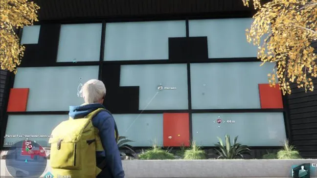 Благодаря камерам, установленным в здании, вы можете получить хороший обзор, не подвергая себя опасности. Пробегите в юго-западный угол здания и встаньте перед стеной с белыми, черными и красными плитками (см. рисунок). Сразу за ней вы увидите камеру. Взломайте ее, и вы увидите справа док с паукообразными ботами. Вытащите паукообразного и захватите его.