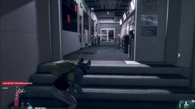 Беспокойно осмотритесь в этой комнате: Здесь есть двое рабочих, но они практически не обращают на Вас внимания. Напротив них находится вышеупомянутая дверь, которую нужно отпереть - к сожалению, с другой стороны. Справа через решетку видна длинная комната, в которой находится экран с уликами, которые нужно сфотографировать. Там же вы найдете планшет с картой-ключом, загрузить которую с этой позиции невозможно. Поэтому взломайте камеру, висящую на стене слева, и возьмите оттуда ключ.