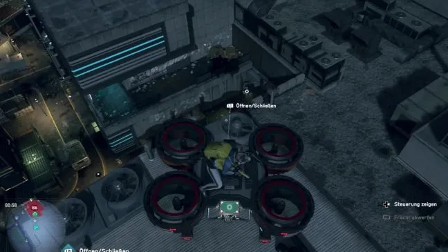 С помощью дрона можно подняться на крышу и расположиться на краю запретной зоны, где установлено несколько вентиляторов. Там можно спуститься в нишу и открыть решетку внизу. Внимание: не лезьте вслепую через отверстие, а спокойно осмотрите помещение за ним. Дождитесь появления охранника и расправьтесь с ним, как только он повернется к Вам спиной.