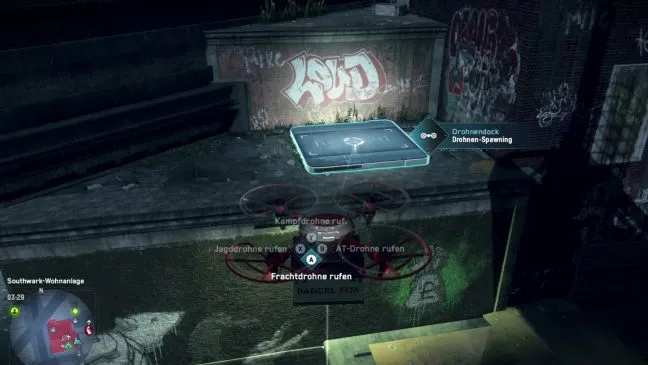 И снова нужно попасть на крышу небоскреба, для чего лучше всего захватить грузовой дрон. Найти его можно, предварительно захватив любой дрон и перелетев на нем в северо-западный угол запретной зоны. Там на крыше небольшого здания или непосредственно рядом с рельсами вы найдете док для дронов.
