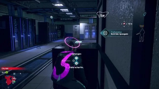 Далее подойдите к северо-восточной двери в противоположном направлении. Взвесьте для себя, стоит ли избегать охранников или расправиться с ними. За дверью быстро займите место справа от небольшого черного сервера и повернитесь налево. Перед вами перекресток с трансформаторной станцией, установленной на земле в центре. Вы можете вооружиться ею и подождать, пока охранник не попадет в вашу ловушку. Затем можно задушить другого охранника сзади, как только он оглянется.