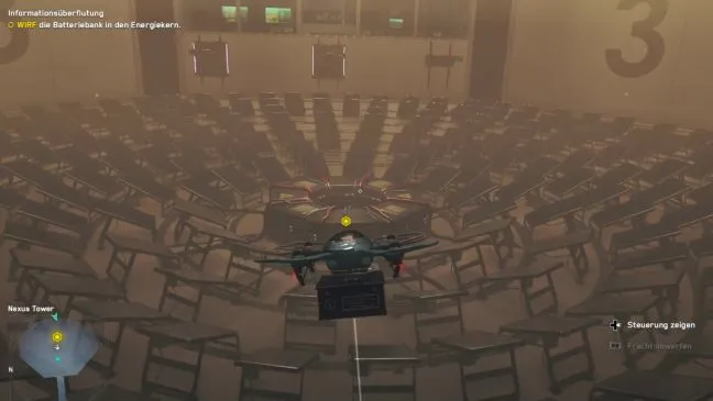 Маркер цели сразу же приведет вас через узкий проход к широкому столу, на котором лежит аккумуляторная батарея. Вы можете подобрать его с помощью дрона и сразу же вернуться к исходной точке. Там вы опустите батарею в светящееся голубым светом энергетическое ядро и сможете спокойно покинуть здание.