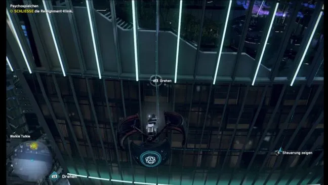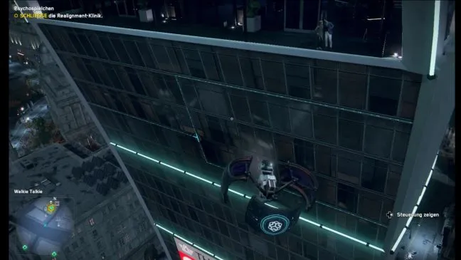Благодаря полученной информации о ноутбуках теперь можно закрыть клинику. Новый целевой маркер приведет вас к коммутатору, но воспользоваться им можно только после завершения строительства сетевого моста. Связанные с ним кабели проходят по внешней стороне здания клиники, поэтому вам необходимо захватить один из летающих снаружи дронов.