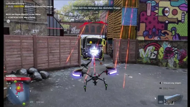 На северной стороне здания находится док для дронов, поэтому, как обычно в Cargo Drone, вы поднимаетесь на крышу и пользуетесь компьютером. Далее следует довольно простое задание, которое не требует пояснений: Вы должны отправиться с модифицированным дроном к пяти целевым маркерам и уничтожить по одной командной машине Альбиона. Для этого используется пушка дрона, которая требует двух-трех попаданий в каждую машину.