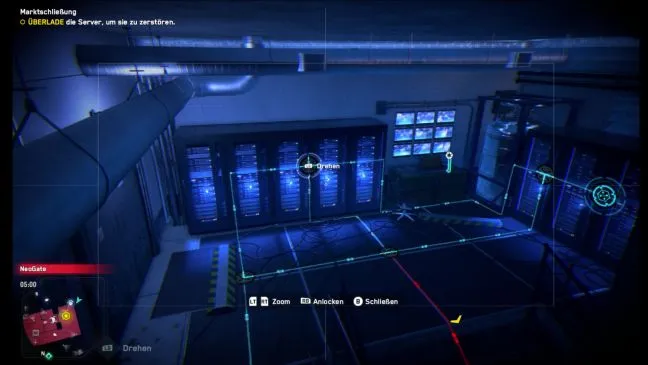 Лучше всего снова переключиться на своего персонажа и повернуться немного влево так, чтобы прицелиться в большую панель дисплея рядом с посылочным аппаратом. Снова просканируйте окрестности и теперь взломайте камеру на потолке, которая видна примерно в этом направлении (см. рисунок). После этого вы окажетесь в темно-синей серверной комнате. Если теперь повернуться и посмотреть на северо-восток, то через окно можно увидеть пару красных металлодетекторов. А слева от них, едва заметный, находится док для паука-бота, с помощью которого можно захватить паука-бота.