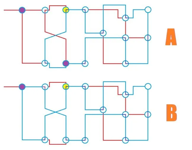 Теперь обратите внимание на L-образную деталь, которую мы отметили желтым цветом на нашем рисунке: Как только вы ее поворачиваете, запускается таймер. По истечении таймера L-образная деталь возвращается в исходное положение - поэтому нужно поторопиться. Непосредственно под ним находится перекресток, который мы обозначили фиолетовым цветом и который необходимо разблокировать. Однако это возможно только в том случае, если повернуть L-образную деталь слева от нее, как на схеме A, - так, чтобы она указывала налево, а не направо!