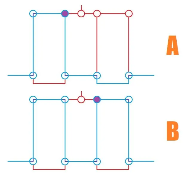 Там Вы увидите два ряда, заполненных L-образными элементами: верхний и нижний. Мы снова сделали рисунок, который поможет Вам разблокировать сначала левый, а затем правый узел в верхнем ряду. Появятся еще одна L-образная деталь и T-образная деталь, но чтобы разблокировать третий узел в середине, необходимо повернуть первую.