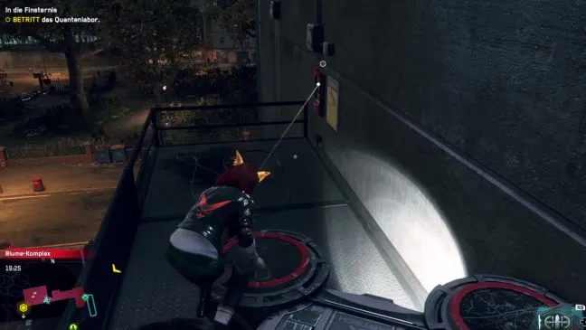 Посмотрите на стену здания и взломайте одну из трех камер, висящих внутри. Если вы все сделали правильно, то увидите темно-синюю комнату и сможете навестись на несколько дронов ctOS, расположенных этажом ниже. Захватите одного из них и найдите в северо-западном углу вентилятор, который можно узнать по оранжевому свету. Вы можете взломать его, и появится отверстие.