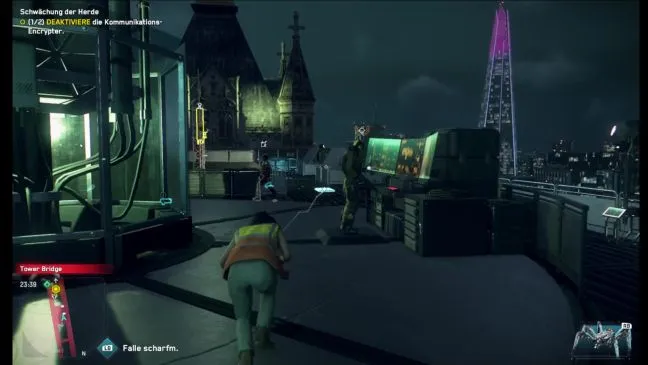 На этот раз игра переносит Вас в центр Тауэрского моста, где Вам предстоит забраться на одну из башен и деактивировать два шифратора связи. Для этого сначала нужно проехать в запретную зону и обойти ее по углам, пока не обнаружите два входа. Оба они приведут вас внутрь башни и к одной и той же лестнице. Перед тем как подняться на последние ступеньки, необходимо взломать камеру, прикрепленную к потолку. С ее помощью можно легко обнаружить охранника, которого сначала нужно устранить со спины.
