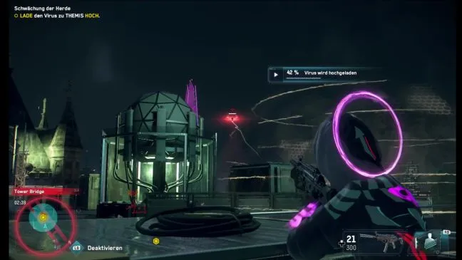 Если большой дрон сломан, переключитесь на другое оружие. Сосредоточьтесь сначала на всех остальных дронах - они доставят вам неприятности быстрее, чем солдаты Альбиона. Если в промежутках вы получите столько урона, что весь экран будет мерцать серым цветом, то бегите к ближайшему лучшему укрытию в направлении северо-востока. В то же время следите за тем, чтобы загрузка вируса продолжалась. Если это не так, то Вы слишком отстали и Вам придется пробиваться обратно на фронт.