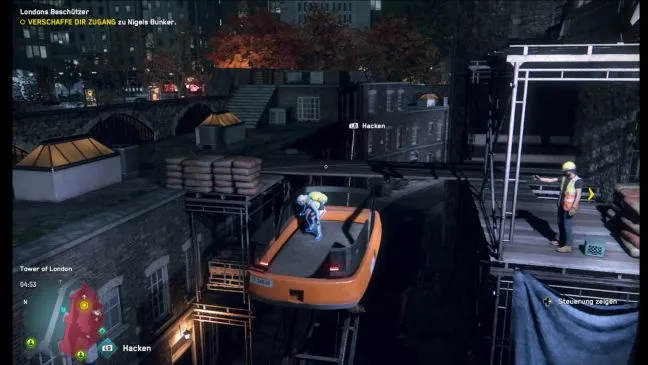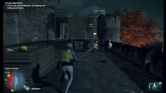После того как вы взломали защитную сетку, можно воспользоваться подъемником. Для этого необходимо подойти к северной стороне башни, где между внутренней и внешней стенами возведен большой строительный лес. К сожалению, ни с одной стороны нет лестницы, по которой можно было бы подняться на подмостки. Но, к счастью, есть другой вариант: лифт, на котором вы поднимались к ключам с западной стороны! Вы можете угнать его, подвести к строительным лесам и позволить ему поднять вас наверх.