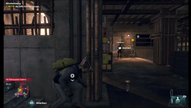 Центр UK Fibrecomm напоминает большую строительную площадку. Сначала выйдите за пределы запретной зоны и внимательно осмотритесь с помощью камер. Одна из них смотрит прямо в комнату с привязанным к стулу контактом. Также вы обнаружите смарт-планшет с ключом доступа, который лежит на контейнере и сразу же будет взломан вами.