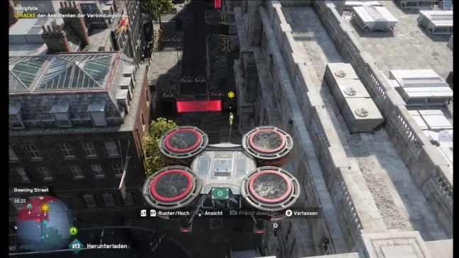 Входить в здание лучше всего по пешеходным мостикам, расположенным в северо-западной части запретной зоны. Над пешеходными мостами за территорией наблюдает антитеррористический беспилотник, который необходимо снять, чтобы обезопасить себя. Для этого посмотрите на серую платформу в конце причала, где находится док для дрона и ящик с бутылками со взрывчаткой. Это позволит вызвать грузовой дрон, захватить его, забрать контейнер и сбросить его на дрон антитеррора.