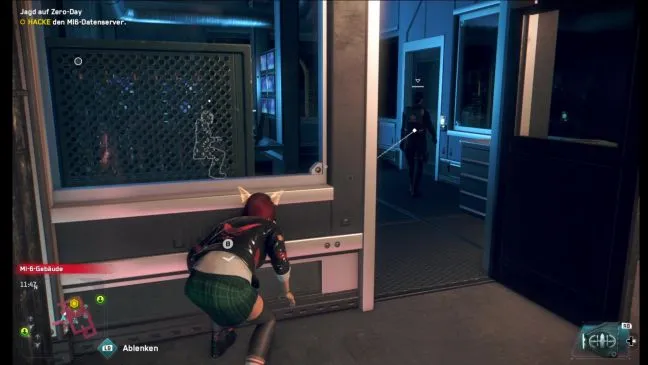 В комнату можно войти через несколько дверей, для которых нужен ключ. Посмотрите на две двери справа и с северо-западной стороны, которые находятся прямо друг над другом: Если просканировать окрестности, то справа от дверей можно обнаружить камеру. Благодаря ей вы сможете заглянуть в длинный коридор, по которому снует туда-сюда охранник. У нее есть ключ, поэтому подождите, пока она не окажется рядом с камерой, и взломайте ее.