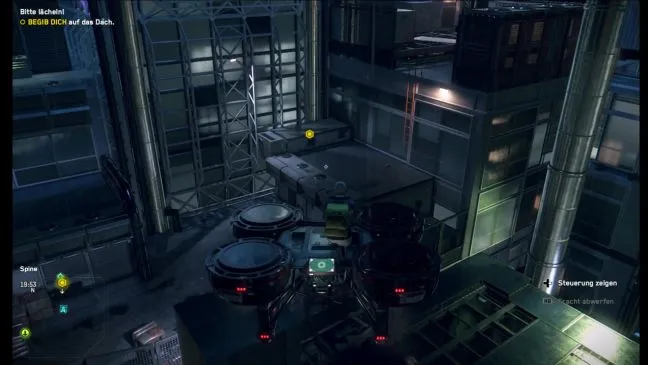 Лучше всего лететь прямо к целевому маркеру и спускаться там как можно быстрее. Наконец, над головой пролетит боевой дрон, с которым нужно как можно быстрее расправиться. После этого следуйте единственно возможным путем, поднимаясь все выше и выше по различным лестницам, ящикам и трубам.