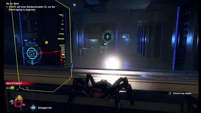 Ваш пункт назначения - Банк Англии, куда следует отправиться в массивной северной части. Проведя сканирование, вы легко обнаружите сервер, который вам предстоит взломать. К сожалению, сначала необходимо пройти по сетевому мосту, который проходит через большой, хорошо охраняемый зал.