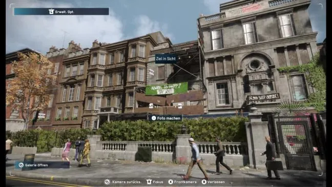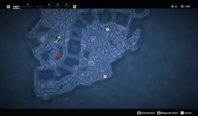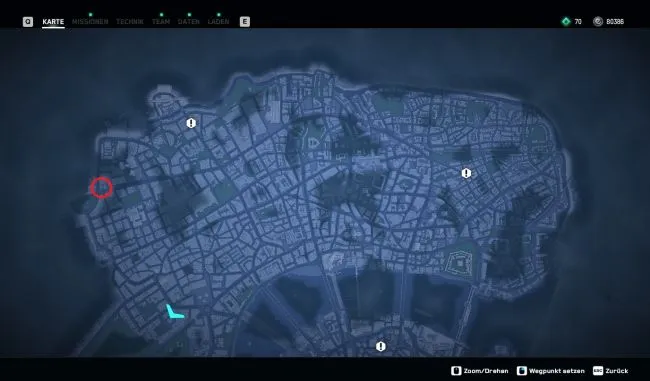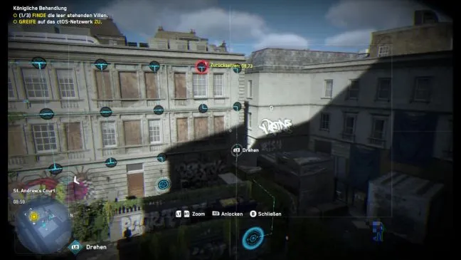 Вход с северной стороны заперт, и его необходимо открыть через сетевой мост. Соответствующие кабели висят на фасаде здания справа от вас, поэтому вы взламываете камеру слева, которая висит на противоположном здании. На следующих двух рисунках показано, как последовательно разблокировать все узлы.