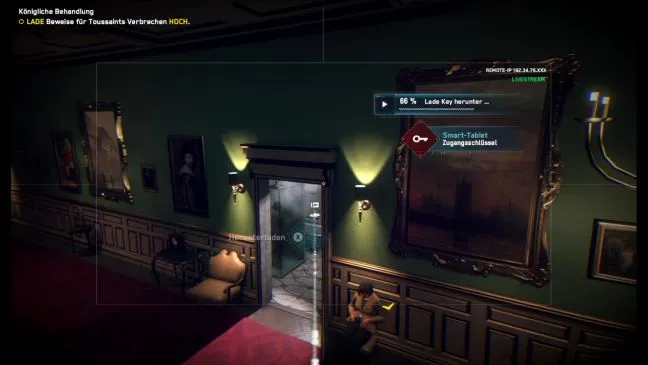 Поэтому прицельтесь в открытую дверь и взломайте камеру, висящую в коридоре. Теперь нужно взламывать камеру против часовой стрелки, пока не увидите сначала плоский стол с чайным сервизом, а затем открытую дверь со вторым планшетом. В последнем находится ключ, который вы тут же хватаете, прыгаете обратно к первой камере и загружаете в нее доказательства преступления Туссена. Затем убегайте на грузовом дроне, и вы выполнили последнее задание Нотта.