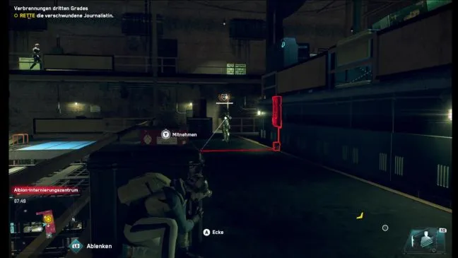 Как только вы доберетесь до гаражей, войдите в первый из них и, держась правее, спуститесь в камеры. Там вы позаботитесь об охранниках в целях безопасности, чтобы иметь возможность передвигаться более свободно. После этого вы можете пройти по красной линии через сканер и взломать еще один терминал охраны, чтобы открыть камеры и освободить журналистку. Чтобы завершить миссию, нужно вывезти ее из зоны по прямому пути обратно.